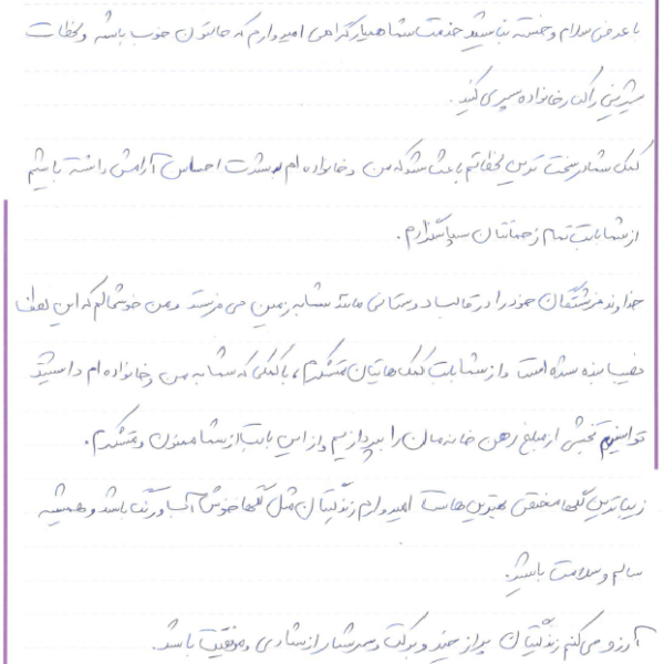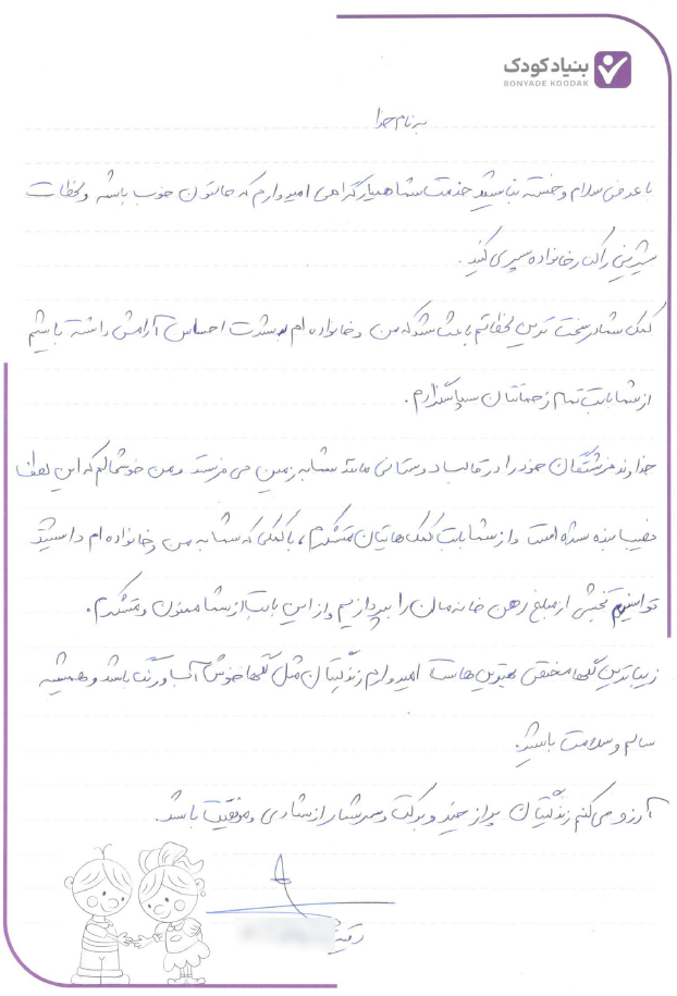 این روزها، خانواده رقیه استرس کمتری را متحمل می شوند و حالشان بهتر و با آرامش بیشتری زندگی می کنند. در ادامه، نامه زیبای رقیه جان را مشاهده می فرمایید: